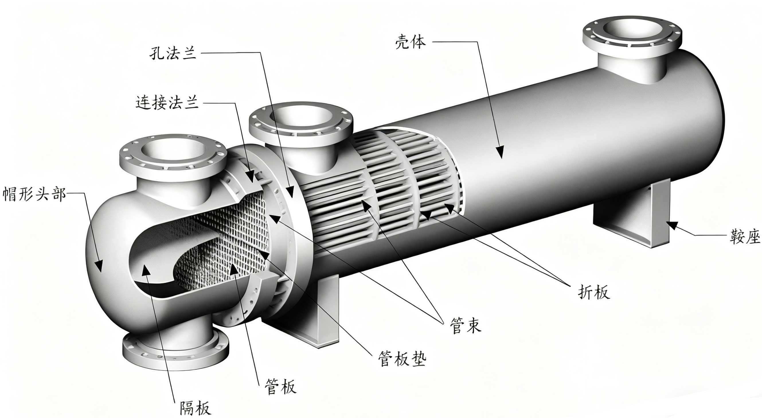 工作原理:以传热管壁为隔离面,将参与换热的两种流体分别引入管程与壳程;高温流体的热量通过管壁传递至低温流体,实现两种流体的热量交换,且全程流体互不混合。