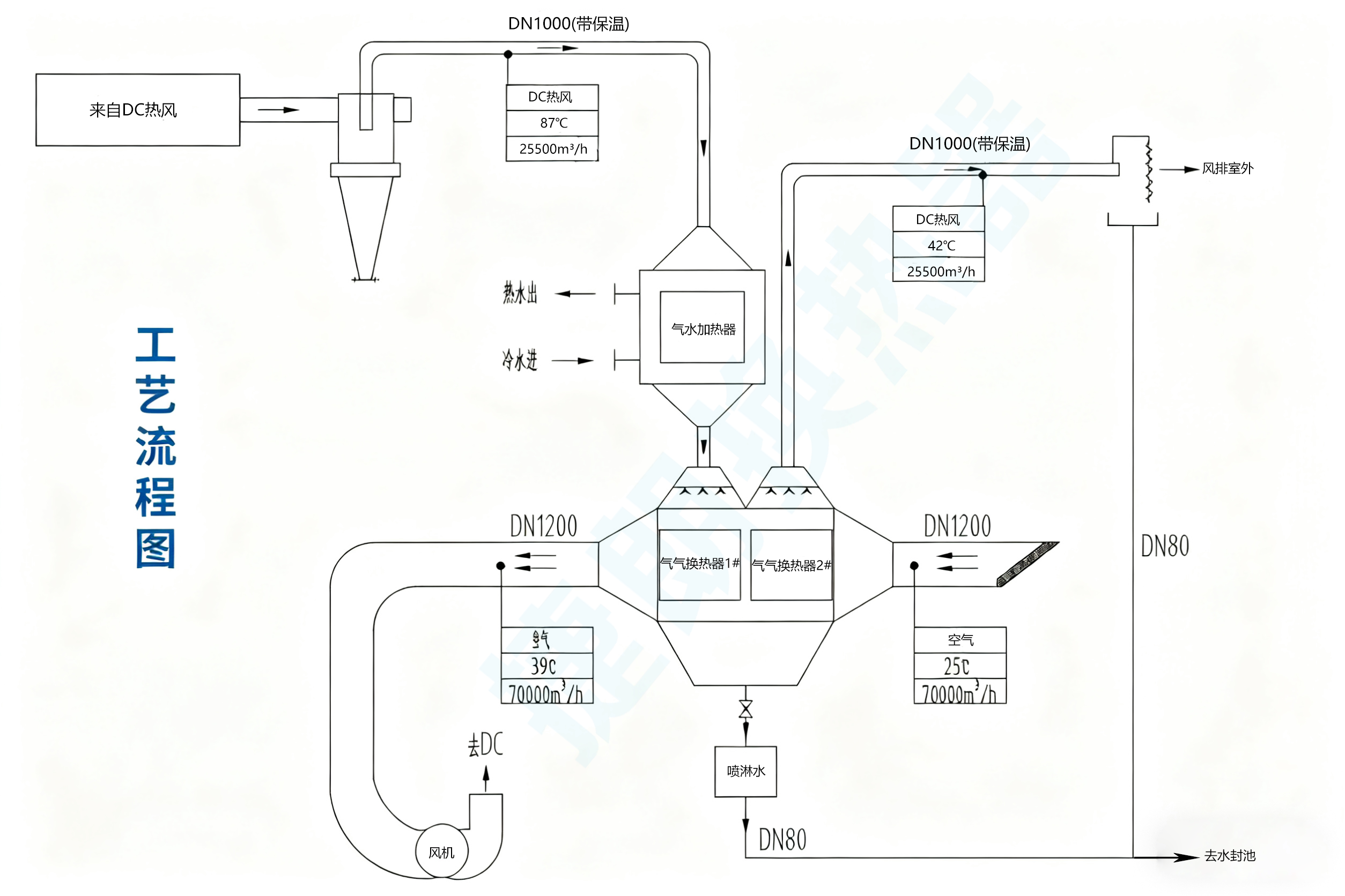 热空气:进口温度80*C至出口温度42°℃处理风量25800m3/h冷空气:进口温度25°C至出口温度39℃℃处理风量70000m3/h